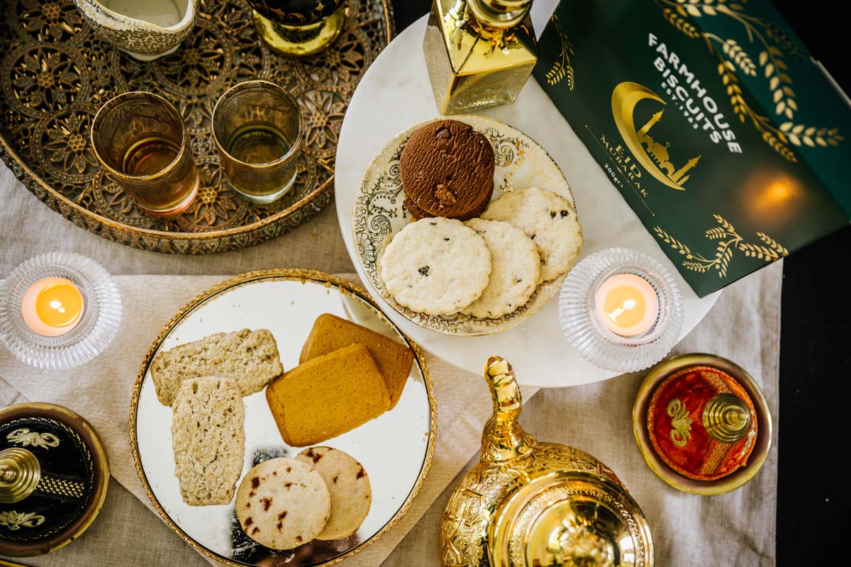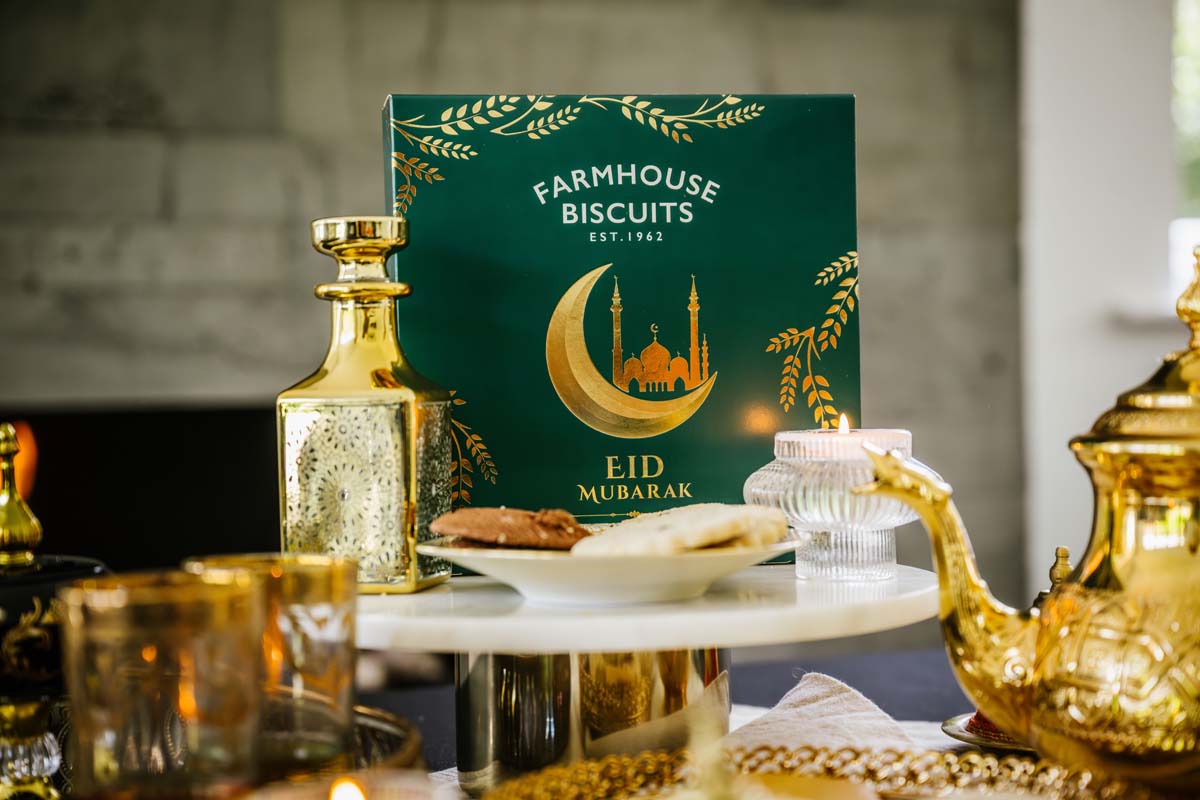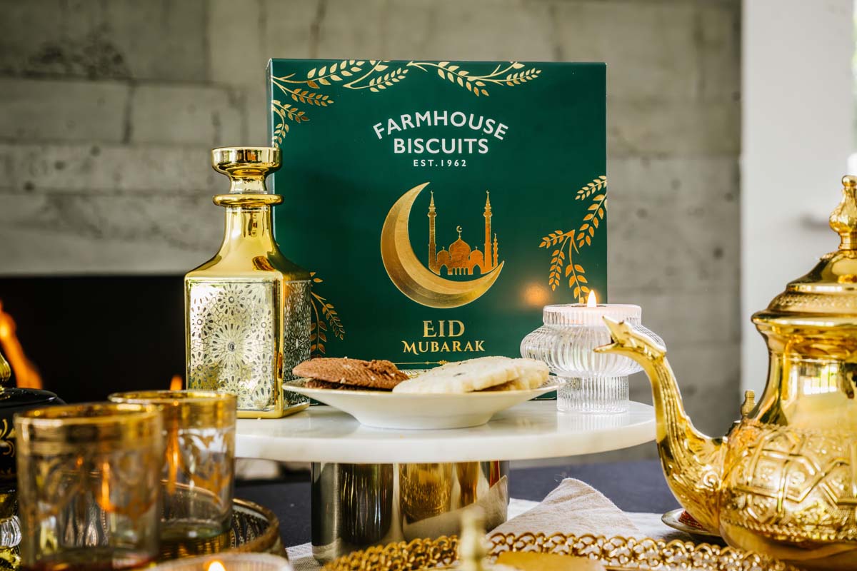 A sleek emerald green biscuit carton with foil design. Eid Mubarak text in both Arabic and English. Filled with an assortment of our best selling biscuits. Designed to add a touch of sweetness to your festivities and deepen the spirit of giving.